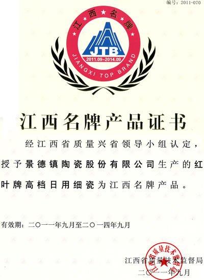 2011年10月9日在南昌召開(kāi)了2011年江西名牌產(chǎn)品及質(zhì)量管理先進(jìn)企業(yè)授牌大會(huì),“紅葉”陶瓷榮獲2011年江西名牌產(chǎn)品稱號(hào)。